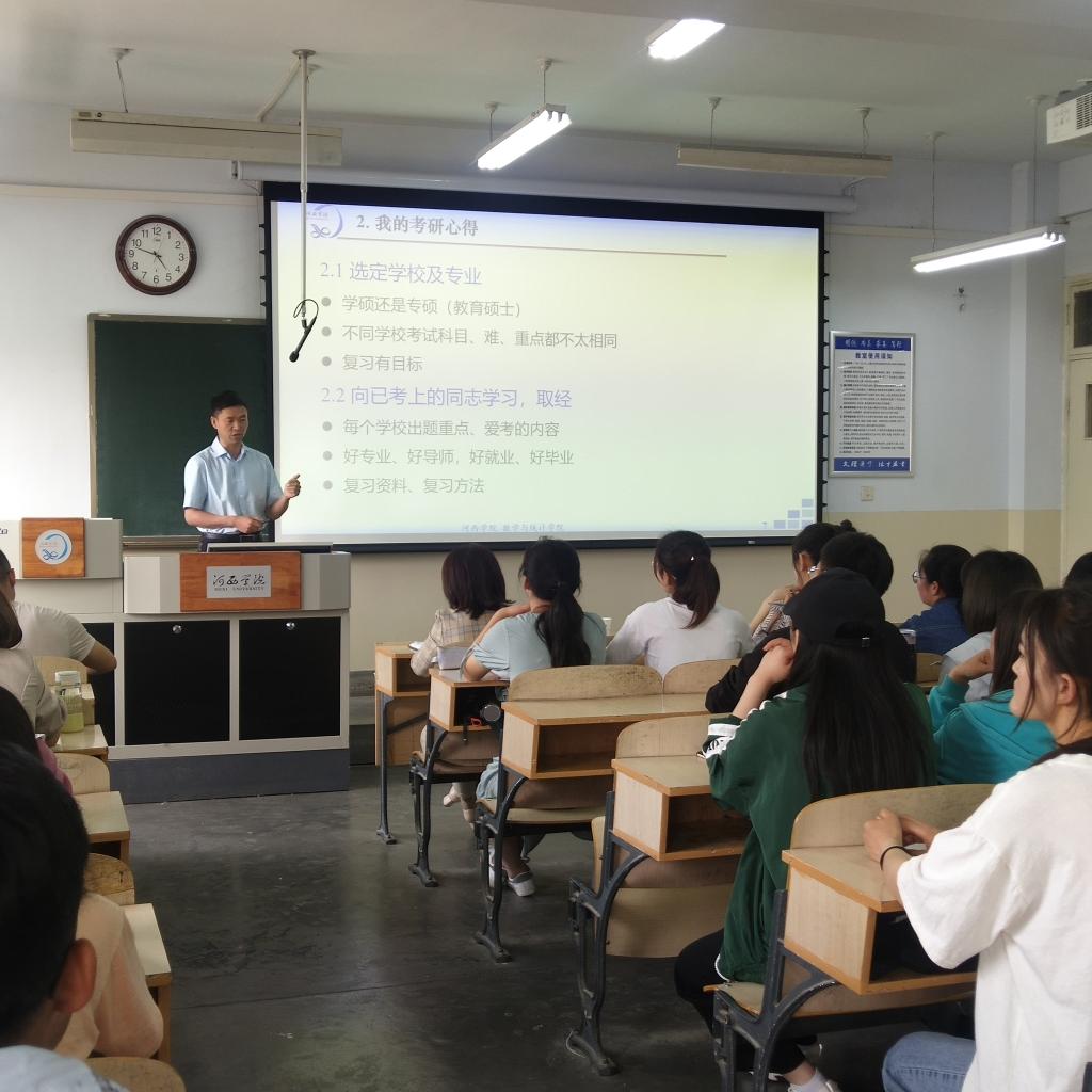 为深入开展“为师生办实事”,进一步帮助员工了解更多考研信息,掌握考研技巧,5月13日,数学与统计公司举行2018级考研辅导报告暨动员大会,邀请公司朱睦正、刘群两位博士作专题辅导报告。公司领导、2018级班主任、辅导员及数学181全体同学参加了报告会。