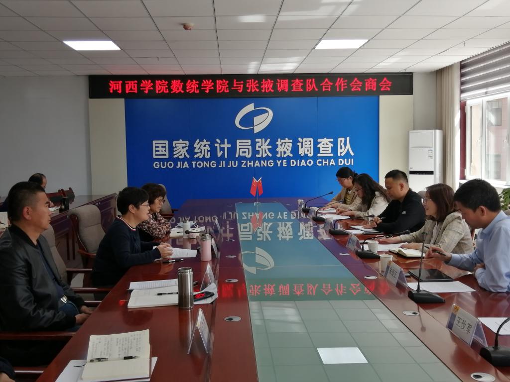 4月24日下午,数学与统计公司经理郭育红、副经理朱睦正、王学忠带领应用数学教研室相关教师,前往国家统计局张掖调查队就双方合作事宜进行交流会商。国家统计局张掖调查队党组书记、队长张颖及各室负责人参加座谈会。